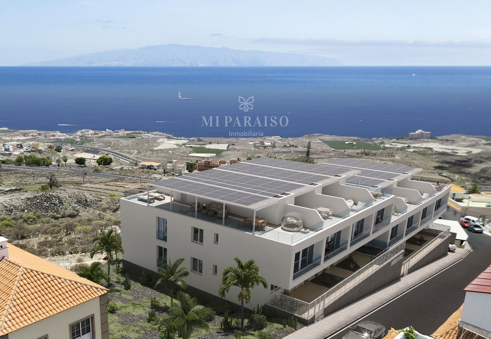 Todas las viviendas cuentan con terrazas orientadas al sur que garantizan sol durante todo el día y unas vistas abiertas y permanentes al océano Atlántico y la costa de Adeje, una panorámica que nunca cambiará.