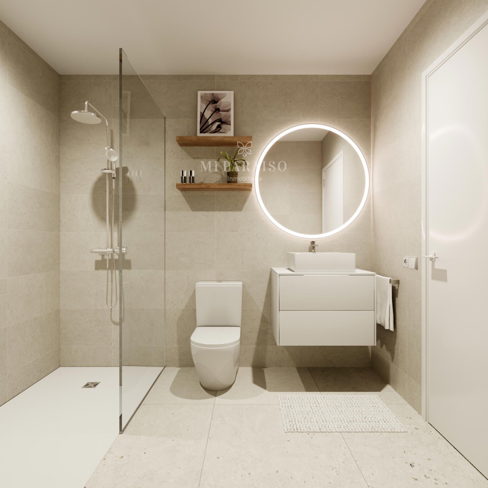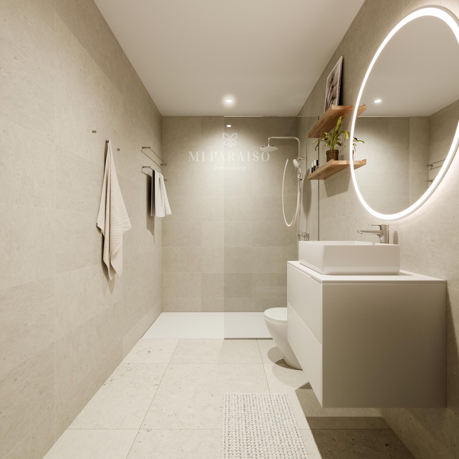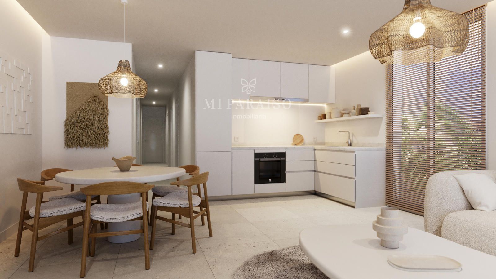 Los baños son modernos y luminosos, con acabados de tonos claros. Las cocinas, abiertas y funcionales, incluyen mobiliario completo y una encimera de piedra natural de alta calidad, además de electrodomésticos de gama alta.